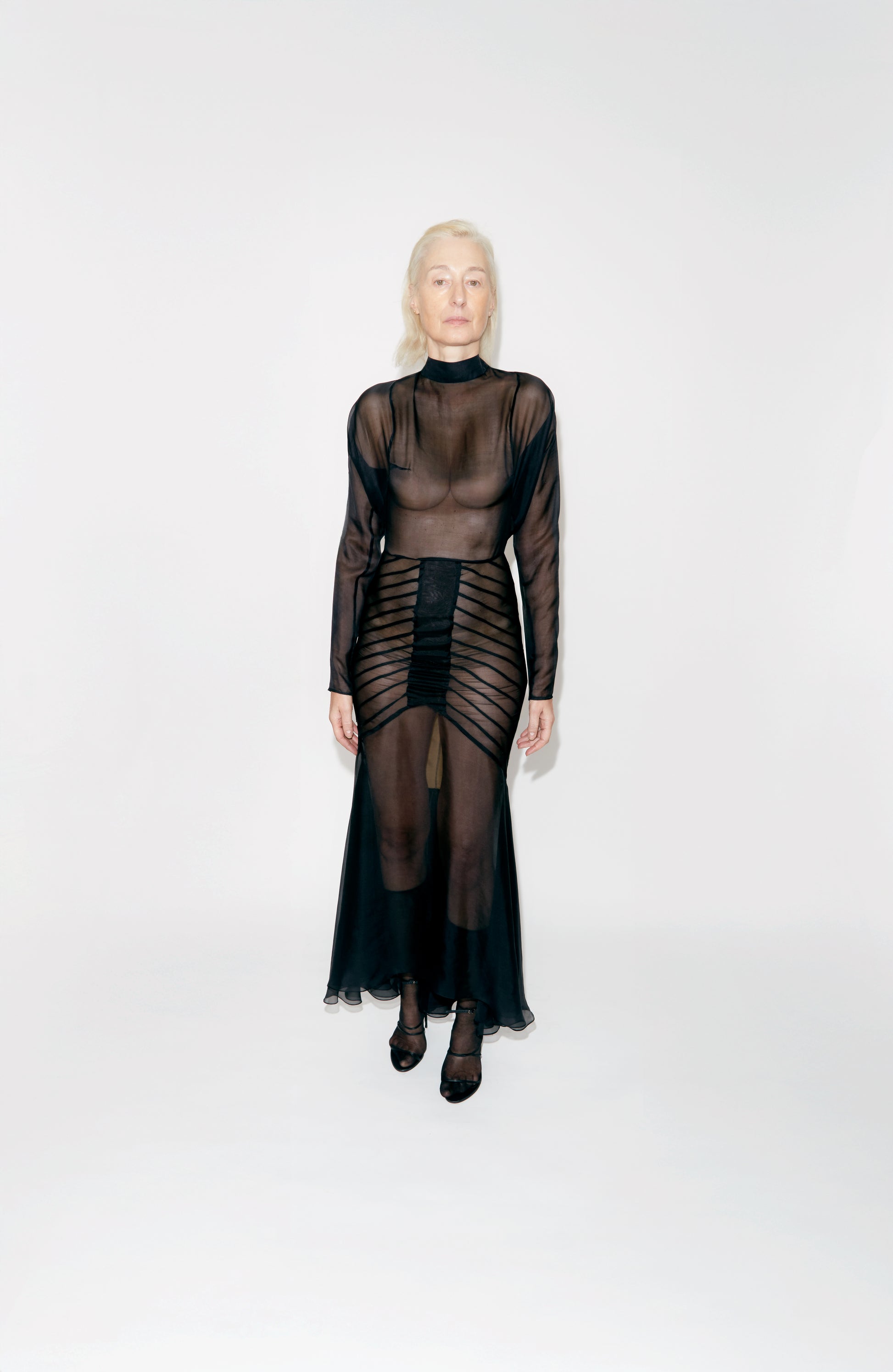 high neckline, elongated sleeves, and a fluid silhouette that gently follows the contours of the body. Fine gathered detailing through the waist and hips adds sculptural