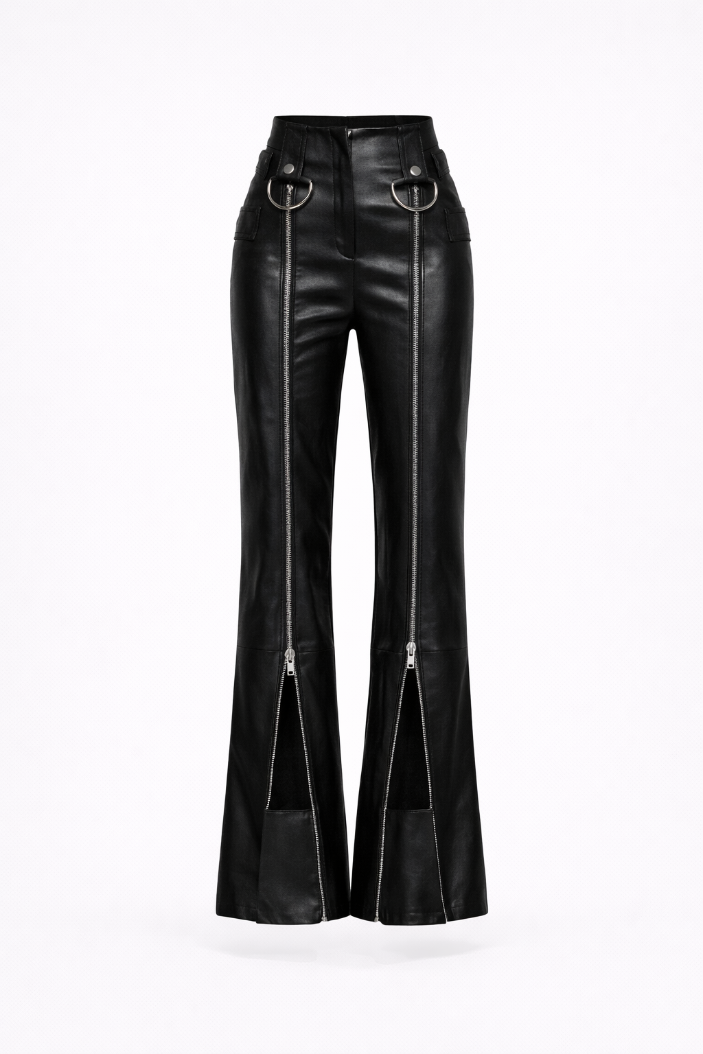 High-waisted cropped leather trouser featuring exposed vertical zippers and oversized D-ring hardware. Designed with a subtle flare and functional zip openings at hem.