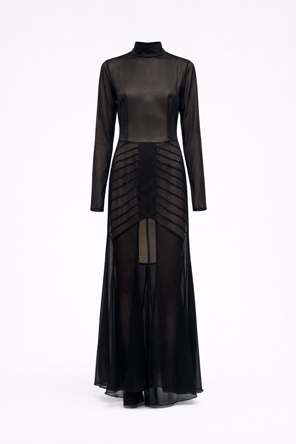 Sheer layered evening dress combining structured panel work with fluid transparency. A modern interpretation of sensual tailoring with architectural detailing and elongating silhouette. Full length sheer dress featuring structured horizontal panel construction at the hip and fluid chiffon skirt extension. Designed to contour the body while maintaining lightness and movement.